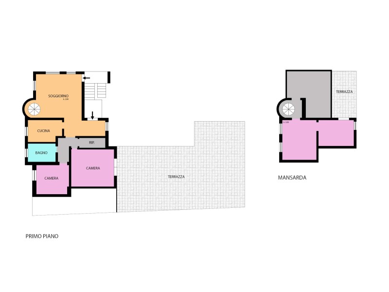 In vendita, non lontano dal centro e dai servizi, zona residenziale con più unità immobiliari, appartamento in villetta bifamiliare ubicato al piano primo di mq 110 circa. All'appartamento si accede da scala esterna esclusiva ed è cosi composto: disimpegno giorno, soggiorno con camino, cucina abitabile, disimpegno notte, camera servita da grande terrazzo, cameretta, bagno. Dal soggiorno per mezzo di scala a chiocciola si raggiunge la mansarda dove troviamo tre locali, uno con terrazzo. Nella vendita al piano terra un capiente magazzino di 53 mq , posto macchina esterno esclusivo, piccolo giardino di proprietà di mq 128. L'appartamento è ben tenuto, se ne consiglia la visita.